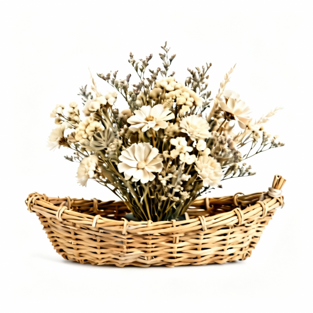 The arrangement includes a variety of naturally dried elements such as bunny tails, wheat stalks, and preserved eucalyptus, creating a visually appealing and long-lasting display. The wicker boat, crafted from sturdy and naturally sourced wicker, provides a rustic and charming base that complements the delicate beauty of the flowers. Its boat shape adds a whimsical touch, making it a delightful conversation starter.