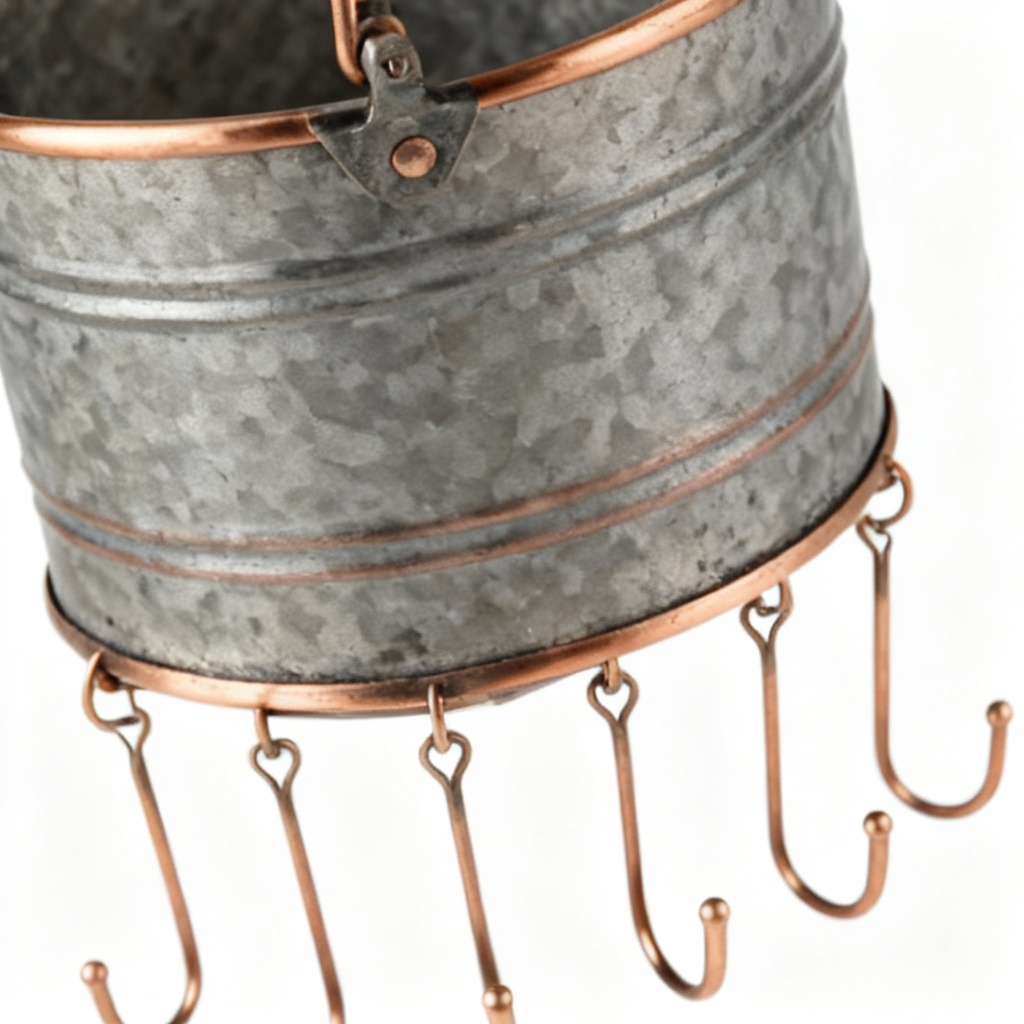 Beyond its aesthetic appeal, this utensil holder is highly functional. It features a spacious interior compartment, perfect for storing a wide range of kitchen tools, from spatulas and ladles to whisks and tongs. Six sturdy metal hooks, also finished with a copper tone, are strategically placed around the holder’s circumference. These hooks are ideal for hanging dish towels, oven mitts, or even smaller utensils, keeping your frequently used items within easy reach.
