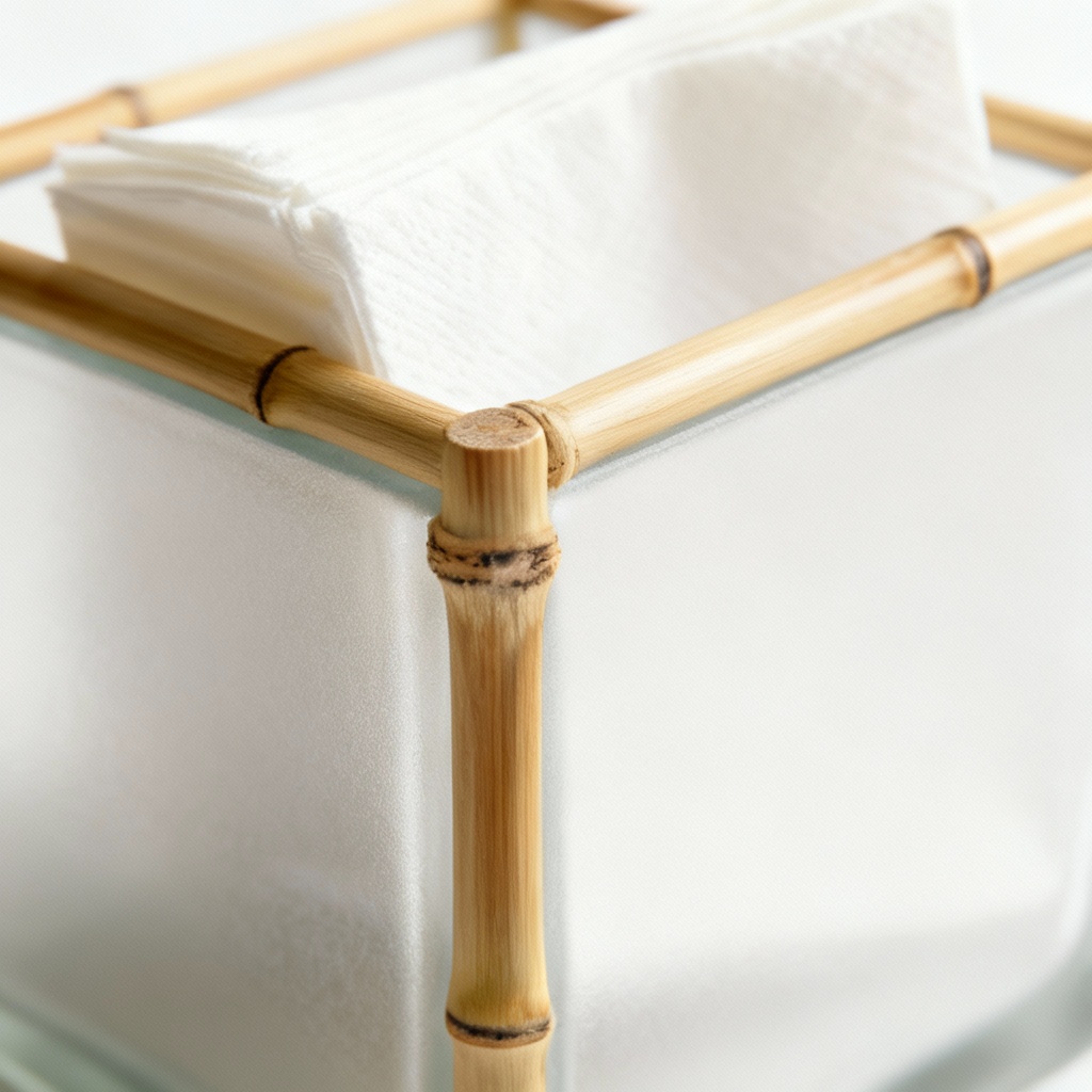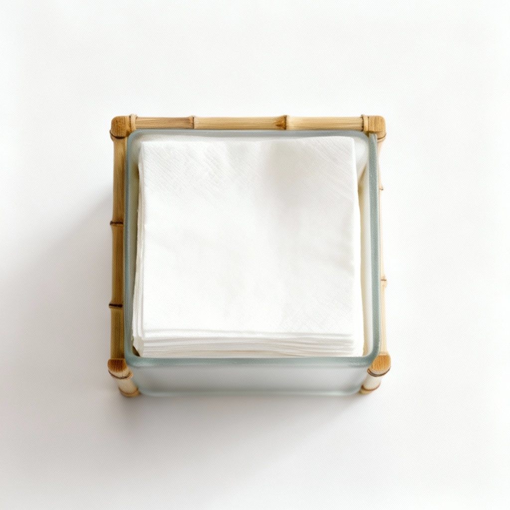 Designed to hold standard-sized paper napkins, this holder combines functionality with aesthetic appeal. The bamboo accents are carefully crafted and finished to ensure a smooth, durable surface that complements the frosted glass perfectly. The open design allows for easy access to napkins while maintaining a clean and organized look.