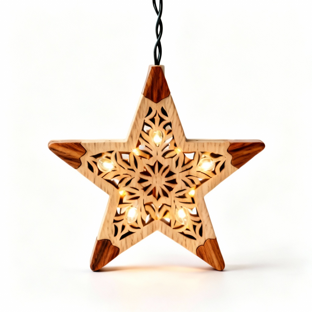 Hand-Carved Wooden Star String Lights – Oak Accents – 10 ft