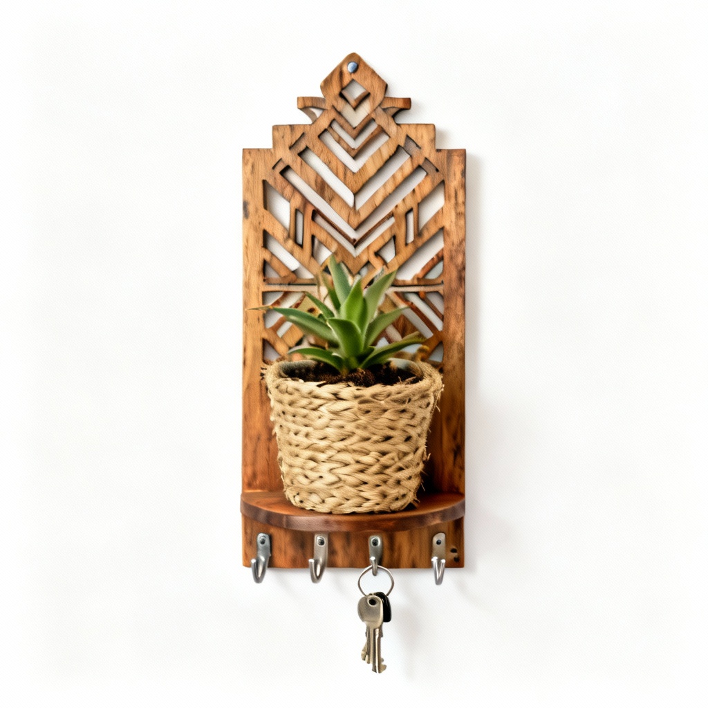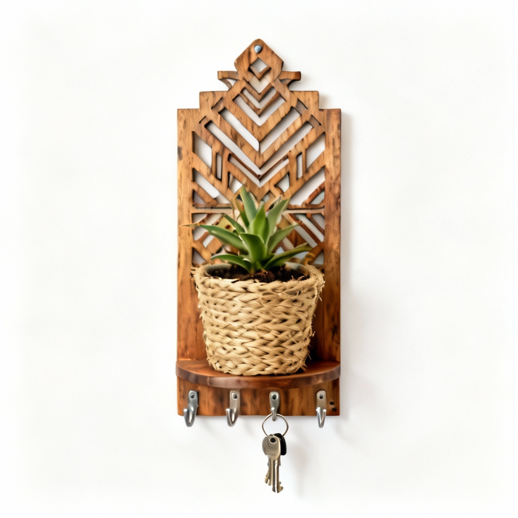 Organize your entryway with this unique and stylish key holder, blending natural materials with a tribal-inspired design. Crafted from sustainably sourced natural wood, this key holder features a hand-woven seagrass basket perfect for holding small plants or other decorative items. The tribal aesthetic is achieved through geometric carvings on the wood backing, adding a touch of rustic charm to any home. This wall-mounted key holder not only keeps your keys organized but also serves as a miniature indoor garden, bringing a touch of nature indoors. The durable construction ensures long-lasting use, while the seagrass basket is easily removable for cleaning or replanting.