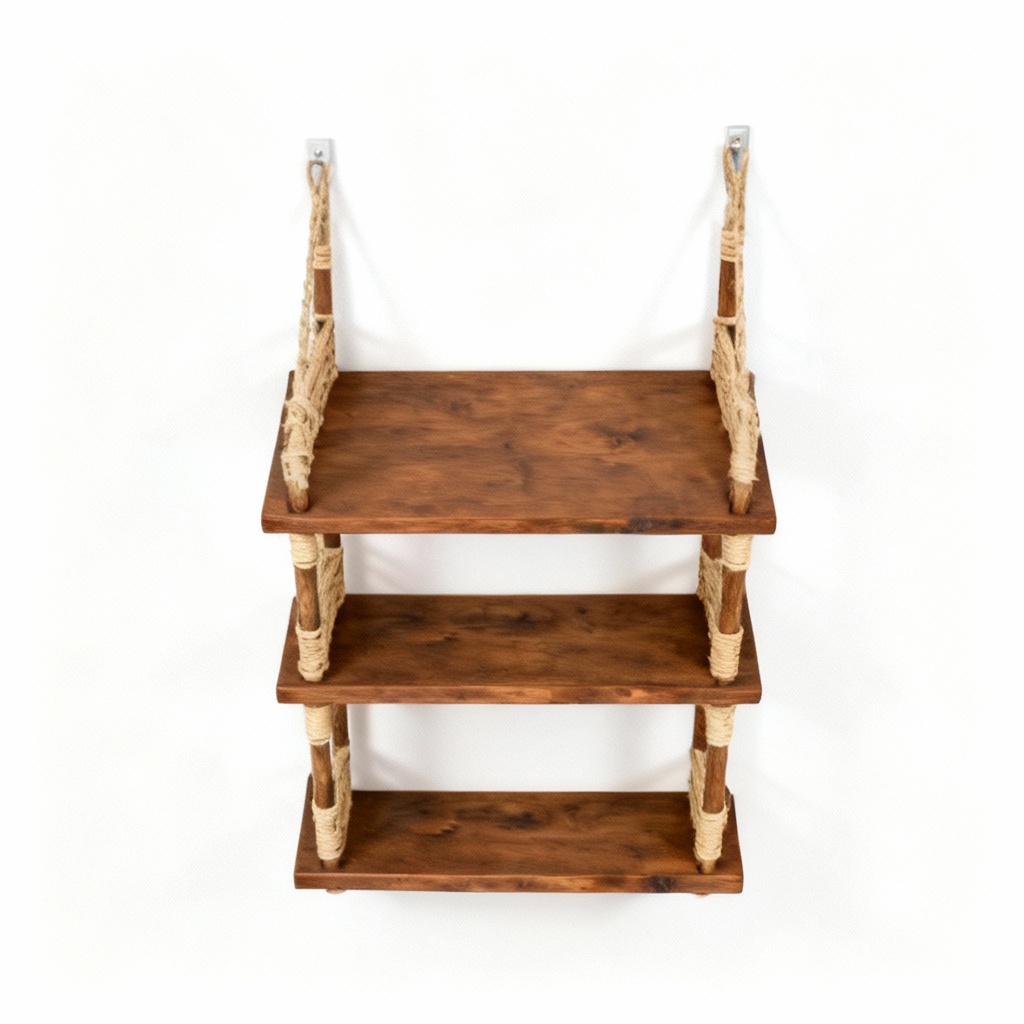 Rustic Wooden Wall Hanging Shelf with Rattan Accents