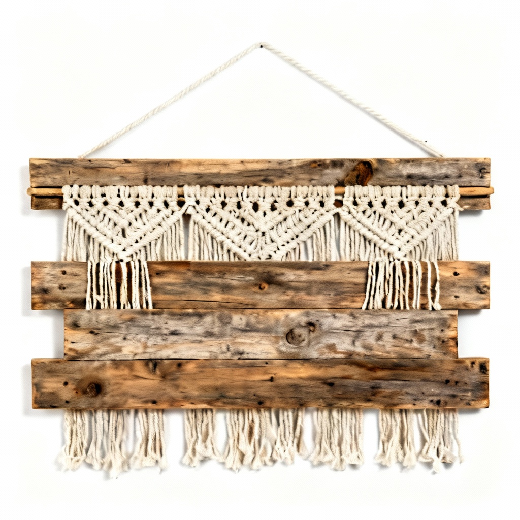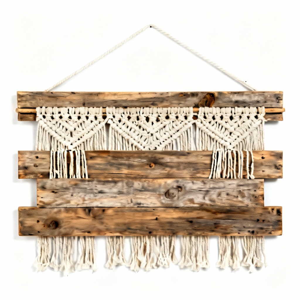 Rustic Wooden Wall Hanging with Macrame Accents – 12×24 Inches